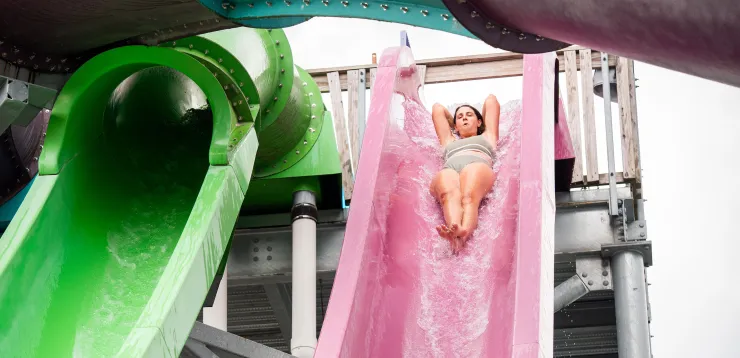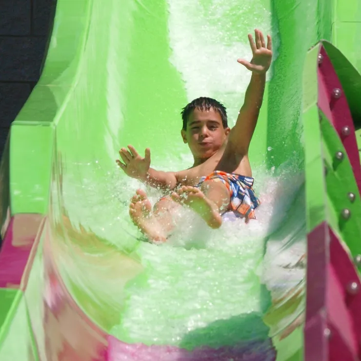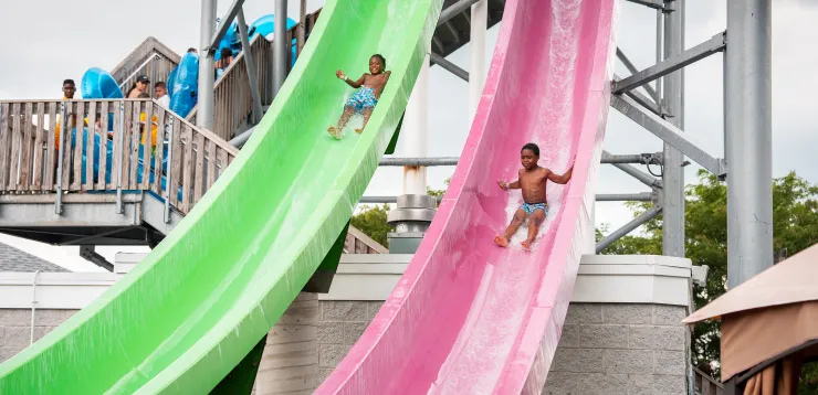 Two high-speed bodyslides — one a steep near-vertical drop, the other a winding speed slide. Not for the faint of heart!